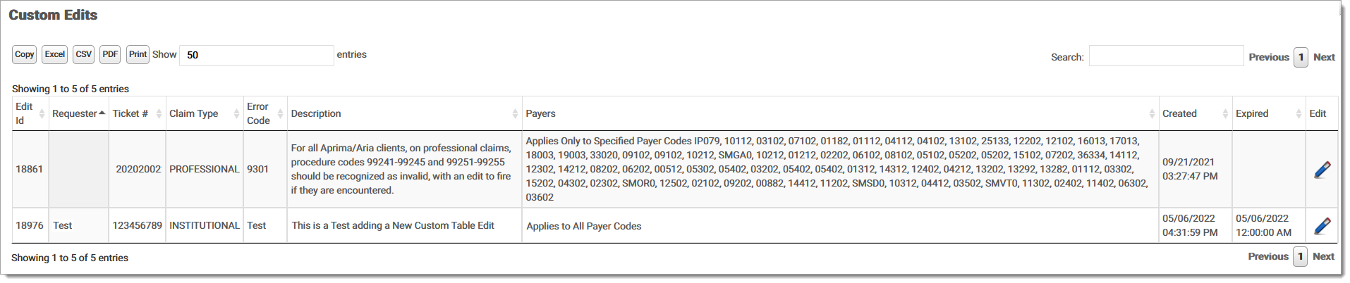 Click Custom Edits from the Administration drop-down menu. The Custom Edits screen displays. The grid includes the edit ID, requester name, ticket number, claim type, description, payers, create date, and expired date. Users may expire any edit rules that are in effect from this screen. Any changes made in Custom Edits displays in the grid.