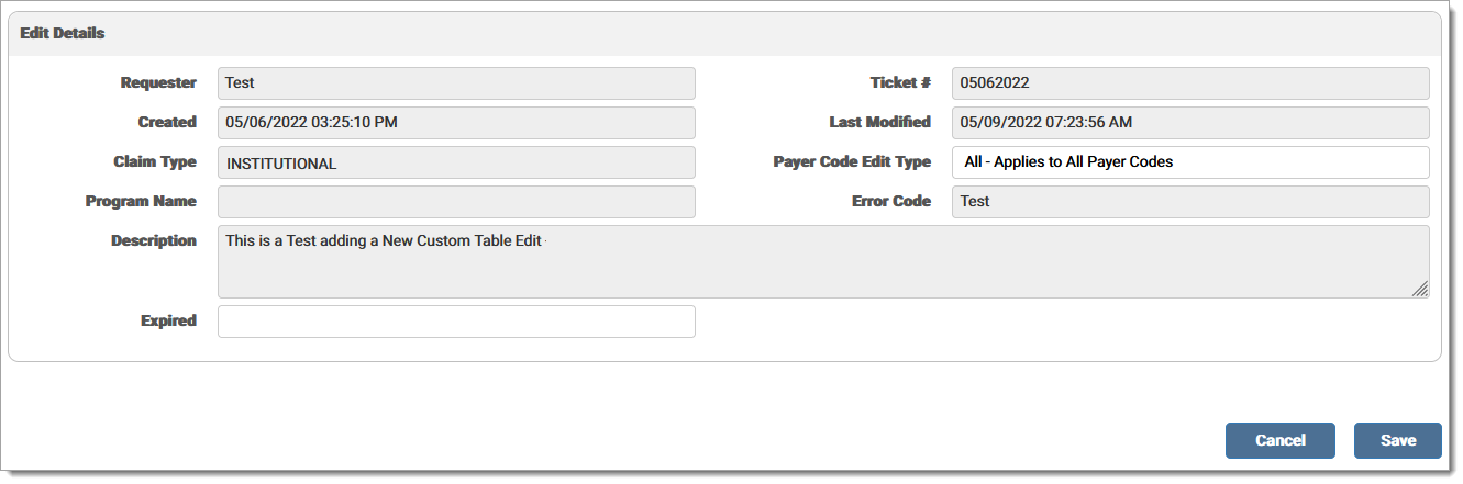 When the user selects the edit pencil, the Edit Details screen displays with the description of the selected edit. Payer Code Edit Type and Expired are the only editable fields.