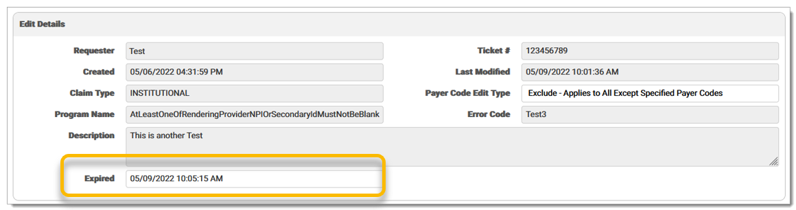 Once saved, the edit is expired in production the following day. If an edit is expired, a time stamp displays in the Expired column in the grid on the Custom Edits screen.