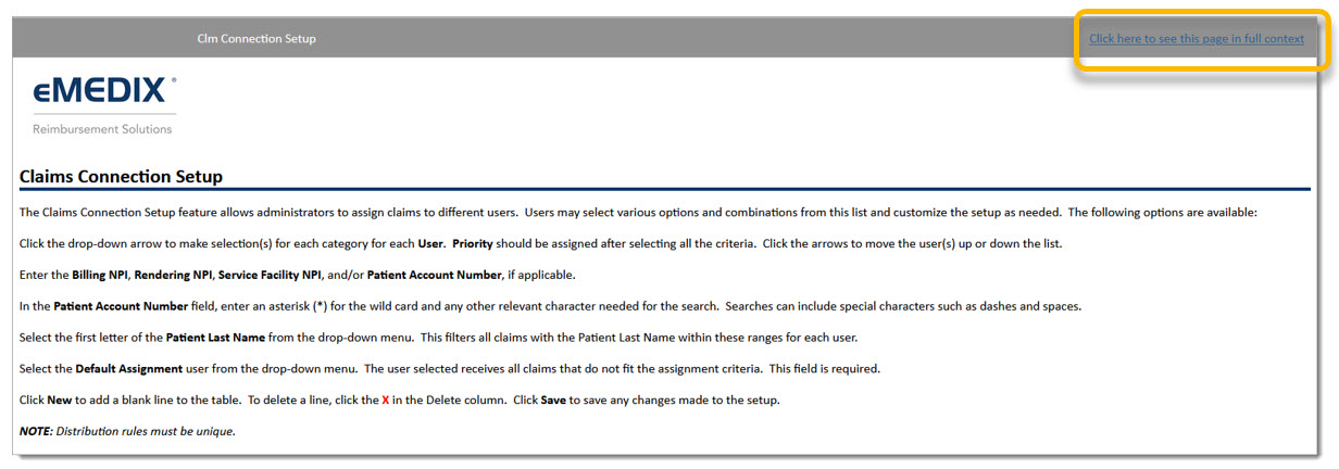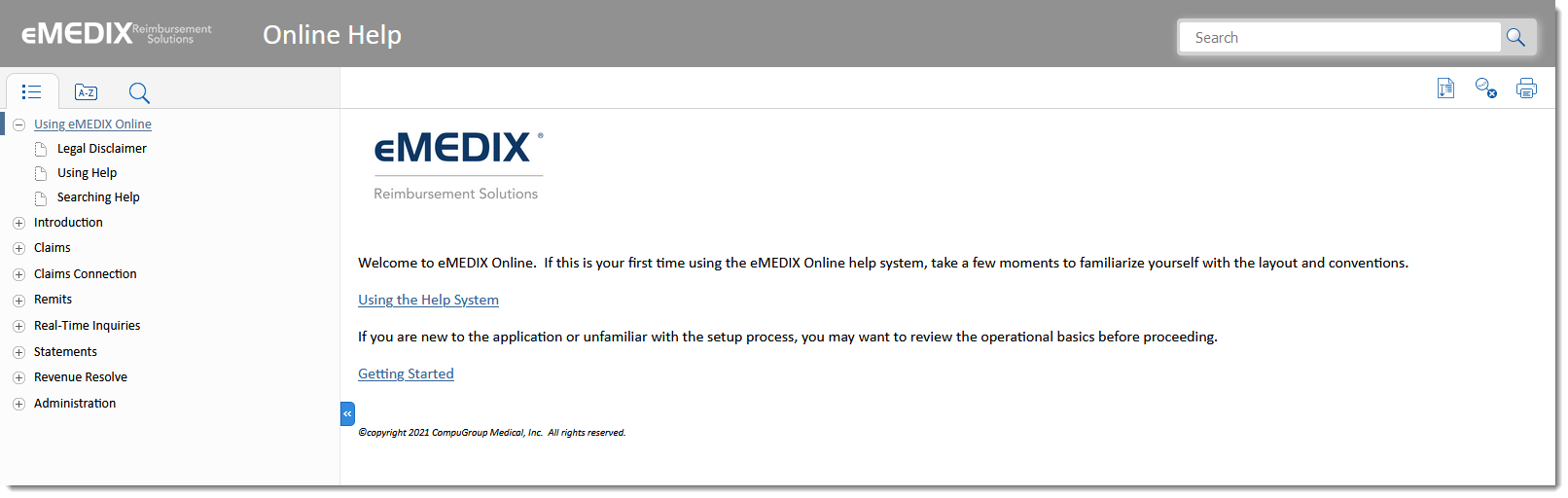 The Help menu provides a link to the complete eMEDIX Online help feature. To view Help, click Help from the Administration drop-down menu. A new browser opens to display the Help feature. Use the Table of Contents, Index, Search, or Print functions to navigate through the system. Click the Information icon located under the TPID selection drop-down menu to open a new window with the help content related to the current screen.
