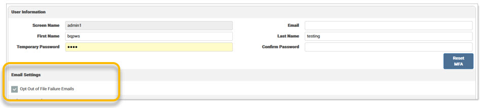 Users with the EMEDIXOnline Site Admin role will see an Email Settings section under User Information, which includes a check box to Opt Out of File Failure Emails. Selecting this check box will stop system-generated emails regarding claim file failures, which are monitored and sent as part of a process running every 15 minutes, from being sent to that user. If the user does not have the EMEDIXOnline Site Admin role, this section will be disabled and hidden from view. Refer to the Claims section for more information on this process.