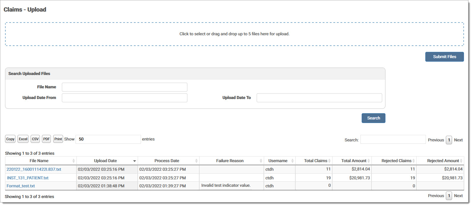 Click the Upload box to select a file, or use the drag and drop feature to move up to five (5) files for upload. Click Submit Files. The grid displays current uploaded claims, as well as any previously uploaded claims from the last 30 days. If a file fails, an explanation message displays in the Failure Reason column. The claim count reflects that number of claims in the imported file.