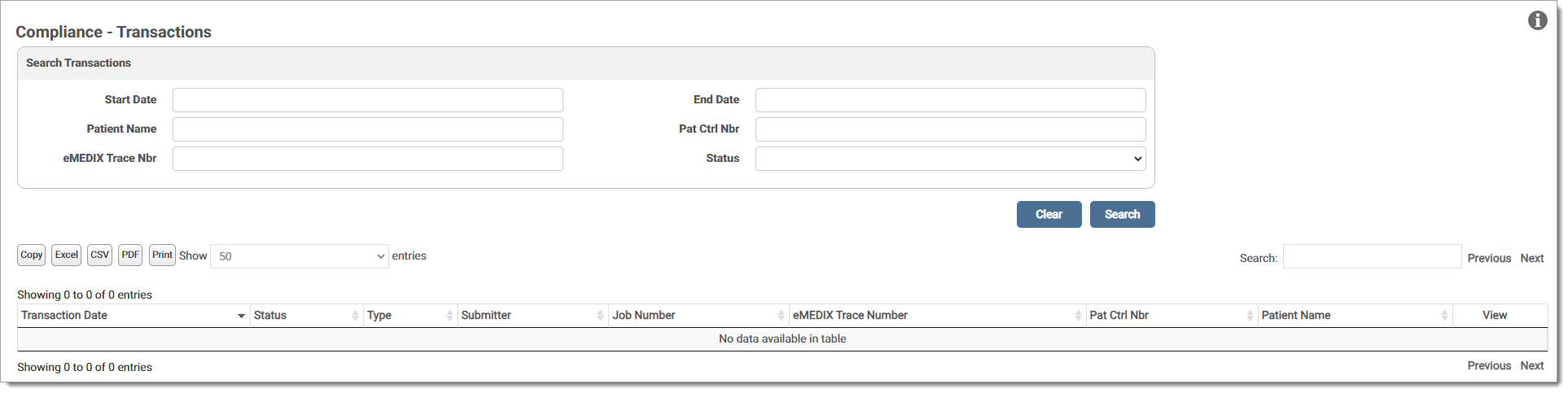 The compliance transactions display in the grid and includes Transaction Date, Status, Type (eMEDIX or Legacy), Submitter, Job Number, Trace Number, Patient Control Number, Patient Name, and View options.