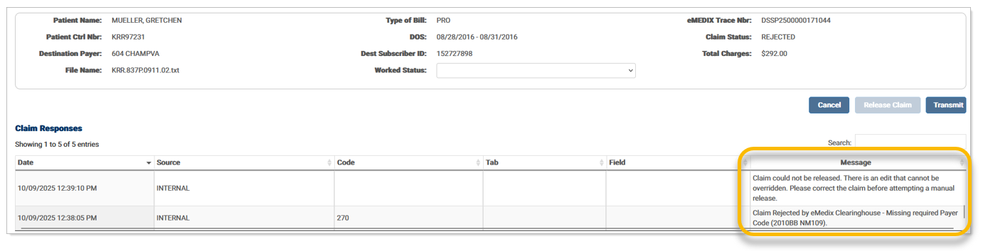A message is added to the Claim Responses indicating the claim was manually released to the payer.