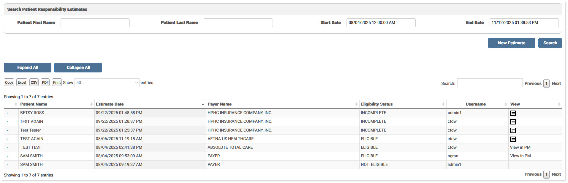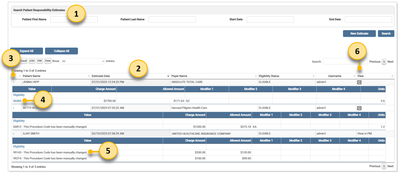 The search results display in the grid. The last 50 patient responsibility estimates are returned in the grid.