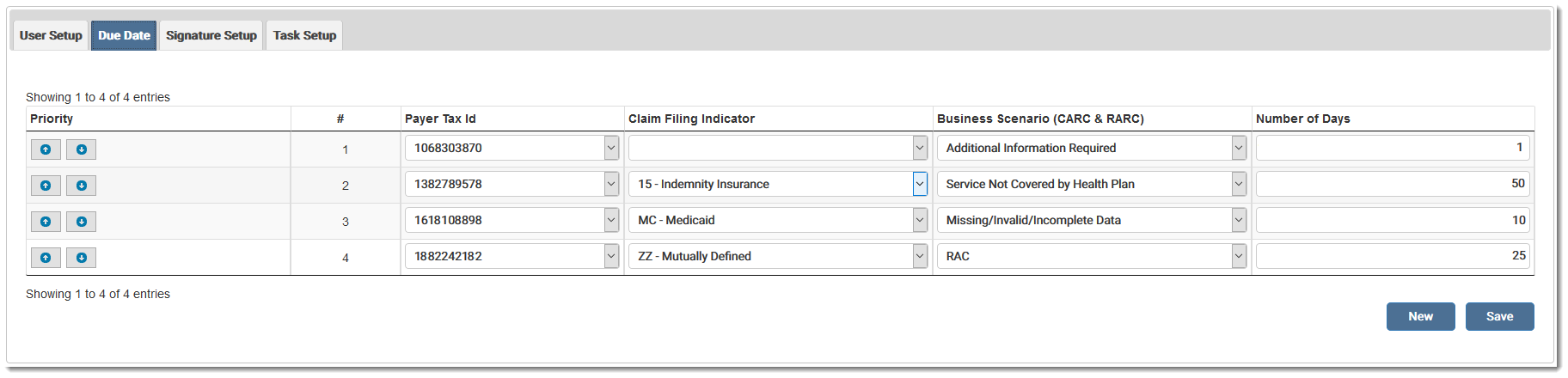 The Due Date feature allows the user to automatically set a due date for a denial. The date can be set by Payer Tax ID, Claim Filing Indicator, Business Scenario, or a combination of any three. At least one option plus the due date must be selected. The user sets the number of days to count to the current day.