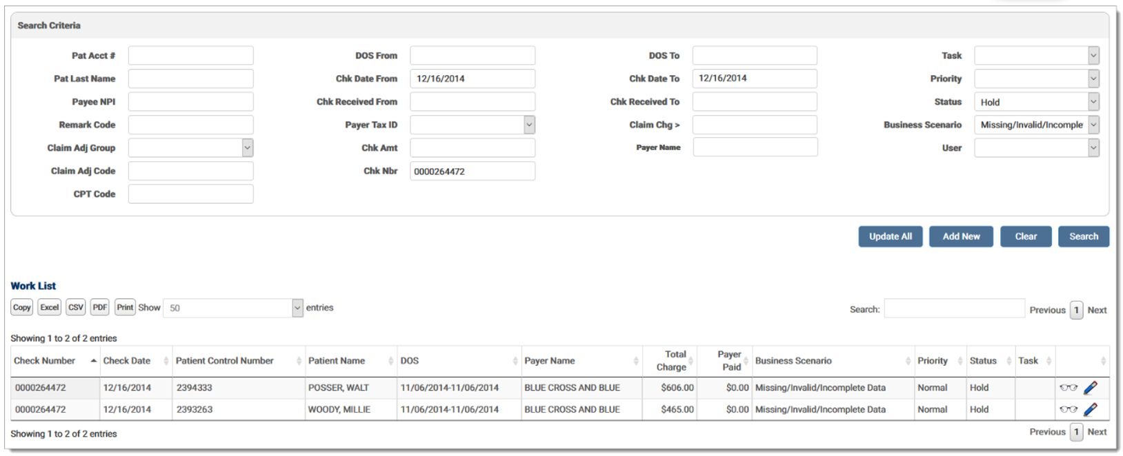 Click Update All. An Update grid displays below the Search Criteria with the available update options. Make the necessary changes and click Save. Once the update is saved, if the changes are different from the filter, the list of denials in the grid may change. For example, if the active filter is New and the status is updated to In Progress, then all the denials will disappear from the grid. Clear the filter to start a new search.