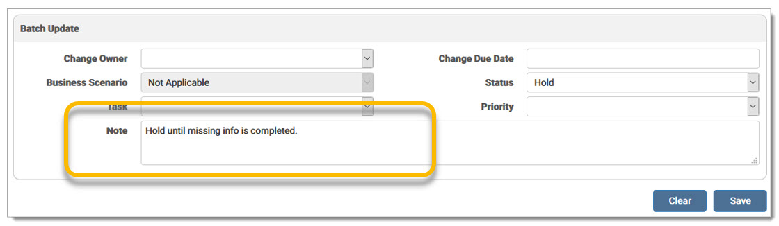 Click Update All. The Update grid displays below the Search Criteria. Add the desired note in the Note field and click Save. A message displays stating the record(s) updated successfully.
