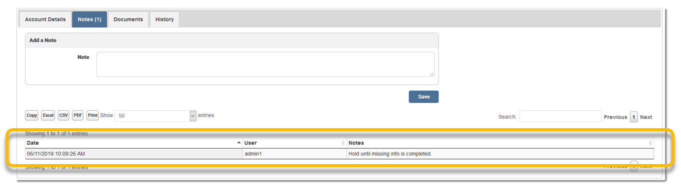 Click the Notes tab of the Account Details screen. The number on the tab indicates the number of notes associated with this remit. The notes displays in the grid at the bottom of the tab. See the Notes Tab section for more information on adding notes to a remit.