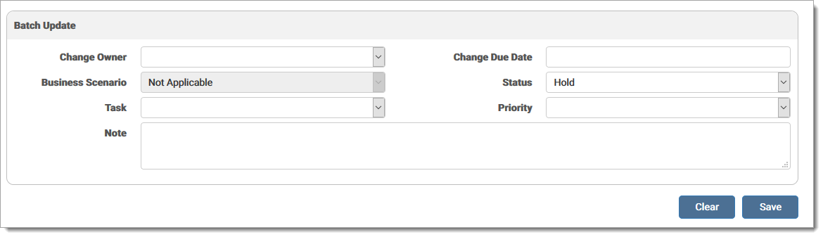 Users may update all claims all at one time for Status, User, Priority, Task, Due Date, and/or Business Scenario. The Business Scenario option is only available for Unspecified. All other Business Scenario options are disabled. The claims must be within an active filter from selecting a link in the Dashboard, or from a search in the Workspace.