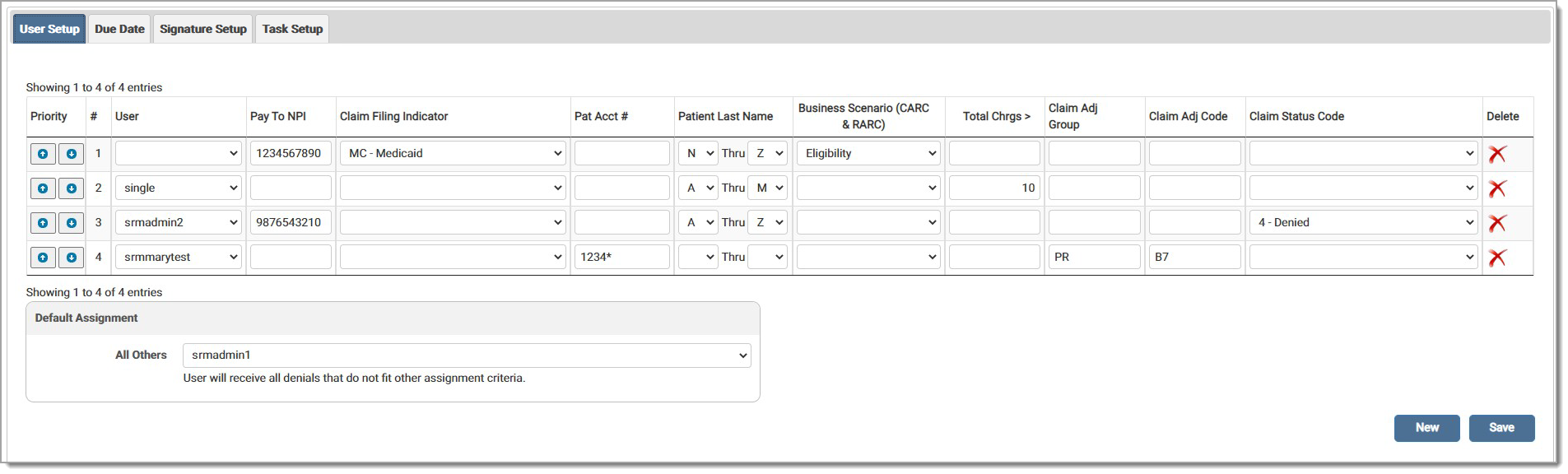 Click New to add a blank line to the grid. To delete a line, click the red X in the Delete column. Click Save to save any changes made to the setup.