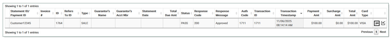 The transaction is available on the Payment Transactions search grid.