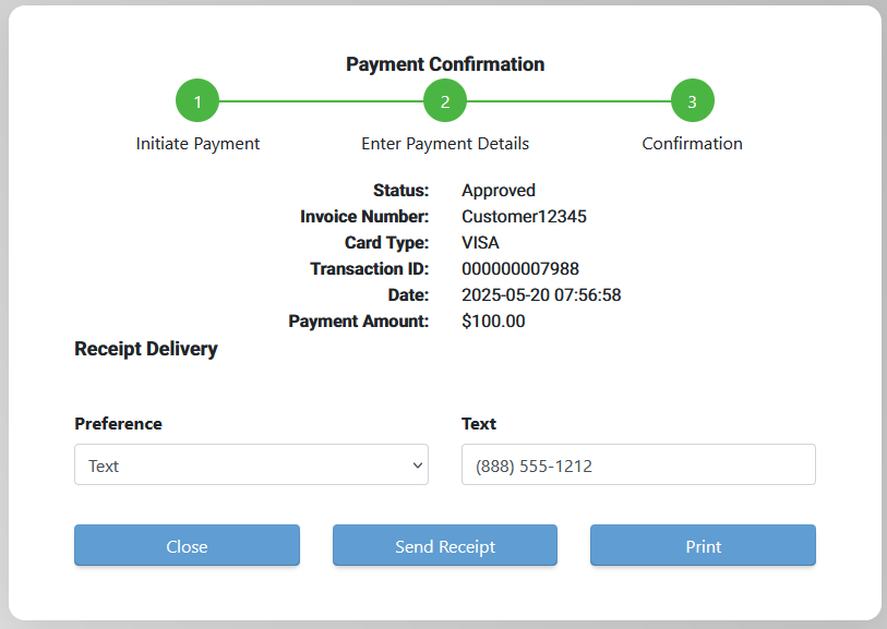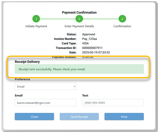 If a receipt delivery option was selected, a message displays indicating the receipt was sent successfully and the Send Receipt button is disabled. Click Print to print a receipt from here or click Close.