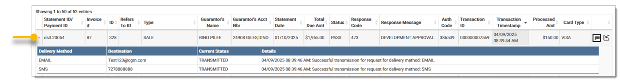 Drill-Down Feature: Clicking on the arrow in the table allows users to expand and view detailed information about the delivery method(s) and specifics. This feature ensures that transaction details are transparent and easily accessible.