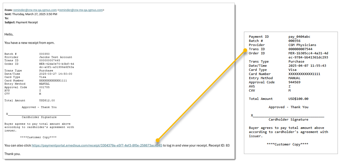 If email is selected as the preference, the patient will receive an email receipt such as the one below, which includes a link to view the receipt online.