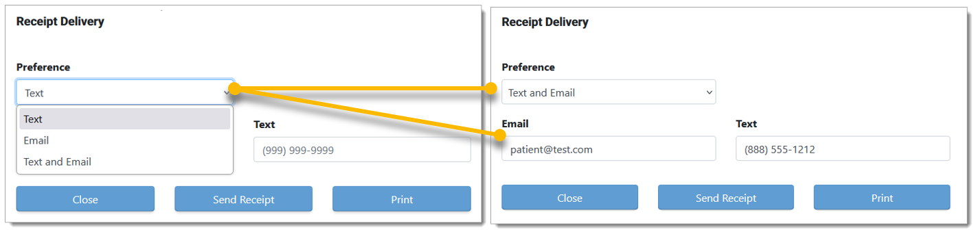 Receipt Delivery allows a user to set their preferences for receiving receipts through email, text, or both. To make a selection, use the drop-down menu on the Payment Confirmation screen, enter the necessary information for email and/or text, and then click Send Receipt to proceed. This customization ensures each user can tailor their receipt delivery to their specific needs. If the submitter is not set up for electronic delivery of receipts, the Receipt Delivery Preference section will not display. See Payment Processor Setup on more information on submitter configuration.