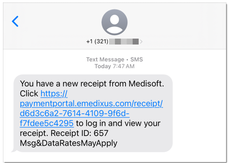 If text is selected as the preference, the patient will receive a text message such as the one below, which includes a link to log in and view the receipt online.
