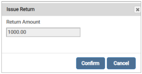 Click the return icon. An Issue Return pop-up displays. The Return Amount is automatically populated in the field. If a full refund is needed, click Confirm. The return amount must be equal to or less than the original transaction amount; it cannot exceed the original amount.