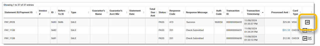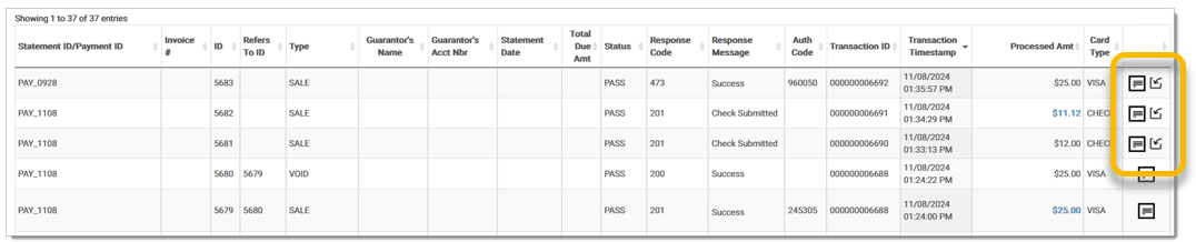 Refunds are processed through eMEDIX Online Payment Transactions. Users must have an account set up with eMEDIX and also have permissions to view. Please refer to the Payment Transactions section for more information. A return icon displays next to the receipt icon if a transaction is eligible for a return. Returns cannot be made for ACH transactions, for previously refunded transactions, or for VOID/REFUND transactions.