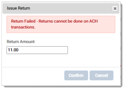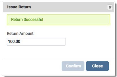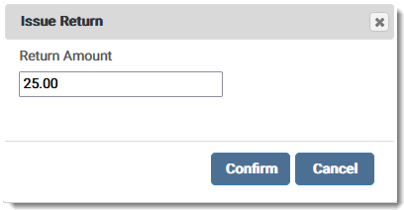 Click the return icon. An Issue Return pop-up displays. Enter the Return Amount and click Confirm. The return amount must be equal to or less than the original transaction amount; it cannot exceed the original amount.