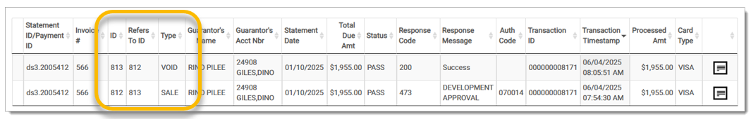 After a void is successful, the Refers to ID column shows the ID of the related transaction. For example, if transaction ID 813 is a void for sale transaction ID 812, the Refers to ID column for both entries will connect these transactions, allowing users to easily track and verfiy the voided sale.